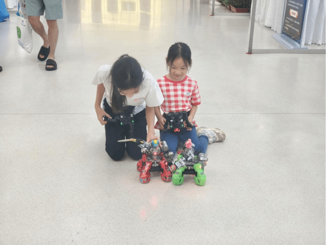 活动现场参与人员络绎不绝,互动氛围热烈。青少年群体在体感格斗机器人展台前排起长队,有序佩戴操控腰带并手持操控柄,通过肢体动作引导机器人完成格斗姿势模拟,过程中不时响起惊叹与欢笑声;来自高校机械工程专业的教授团队俯身观察工程机器人的机械结构运作,就传动系统精度、控制算法优化等技术细节与团队成员展开深入交流,现场弥漫着浓厚的科技探索和交流互动氛围。