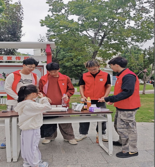 在社区广场上,志愿者们携带实验器材支起“科学小课堂”。桌上摆满色素、牛奶、烧杯等材料,“梦幻彩虹雨”“水母烟花”“沸腾的彩虹奶”等实验道具整齐排列,吸引了众多小朋友驻足围观。孩子们围在桌前,眼神中充满期待,不时向志愿者提问:“这个颜色真的会像彩虹一样吗?”“我能自己试试搅拌吗?”现场热闹又有序,科学探索的氛围悄然升温。
