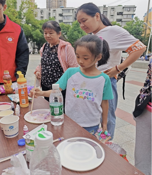 随着“小课堂”开课,志愿者先演示了“沸腾的彩虹奶”实验:将色素滴入牛奶,再滴入洗洁精,原本沉在杯底的红、黄、绿三色突然“沸腾”般扩散,交织成绚丽的彩虹纹路。孩子们惊呼着伸手触摸杯壁,随后在志愿者指导下亲手操作——有的小心翼翼搅拌溶液,看着颜色在牛奶中“跳舞”;有的专注观察“梦幻彩虹雨”中色素在水中缓缓下沉的轨迹,还拉着家长一起记录色彩变化。家长们也饶有兴致地参与进来,与孩子共同探索科学现象的奥秘。